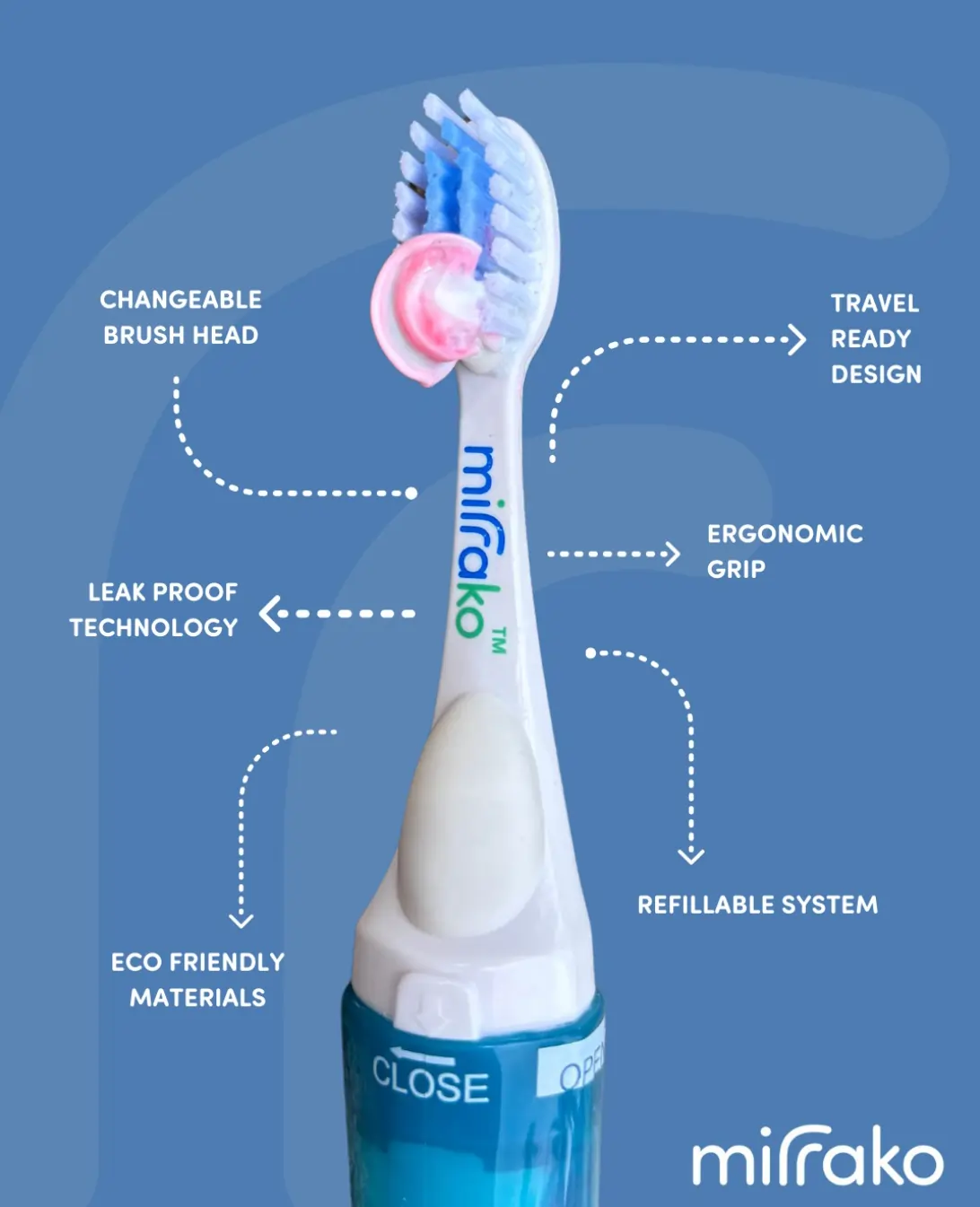 The Mirrako Refillable Toothbrush is a groundbreaking innovation in oral care, combining sustainability, convenience, and high-performance features. Designed with a refillable toothpaste chamber, this toothbrush helps you reduce waste while enjoying an exceptional brushing experience. Whether at home, on the go, or traveling, its compact design ensures that you never compromise on cleanliness and efficiency. With interchangeable brush heads, you can extend the life of your toothbrush and keep your routine eco-friendly.